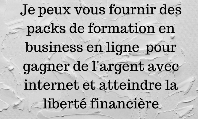 Il est important de nos jours d'être entreprenant. Pour cela j'ai des formations dans plusieurs domaine qui pourront te permettre de commencer ton propre business en ligne et de gagner tes premier dollars sur internet. Afin de vous aidera atteindre la liberté financière je vous offres les meilleurs formation sur les différents type de business en ligne qui existe avec un ebook offrir gratuitement de votre choix et un autre ebook surprise que je vous offre de plus sur chaque packs de formation que vous acheté.